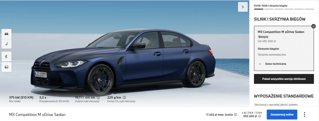 A ile będzie kosztować najdroższa trójka w sedanie? Jeśli skusimy się na M3 Competition M xDrive Sedan z silnikiem 510 konnym i napędem na 4 koła, z indywidualnym lakierem i skórzanym wnętrzem, plus dobierzemy dwa pakiety wyposażenia (nie będę opisywał co na ten pakiet się składa, bo miejsca mogłoby zabraknąć) przyjdzie nam zapłacić słono bo ponad pół miliona, a dokładnie 550 200 zł brutto. Grubo…