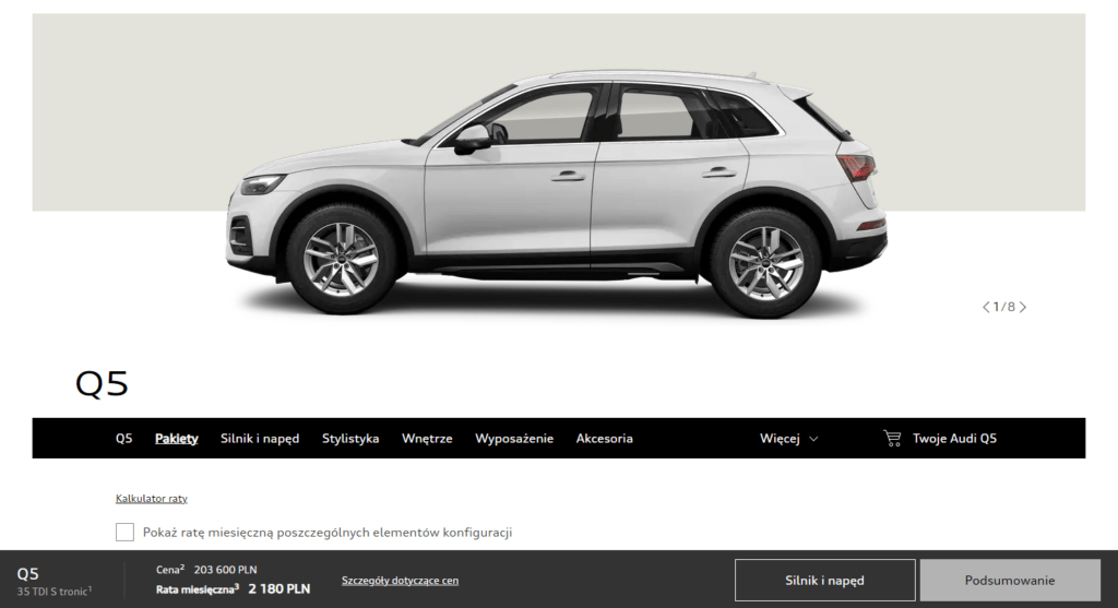Jeśli chodzi o Audi to różnica cenowa pomiędzy najdroższym i najtańszym modelem będzie porównywalna z pozostałymi konkurentami. Fakt ten wpływać będzie z kolei na wysokość rat w poszczególnych wariantach. Najtańsze Q5 możemy mieć już od 1749 zł netto miesięcznie do 3678 zł netto. Najdroższa wersja to wydatek zdecydowanie wyższy od 4085 zł netto do 8591 zł netto. Rozbieżności porównywalne z BMW 3.