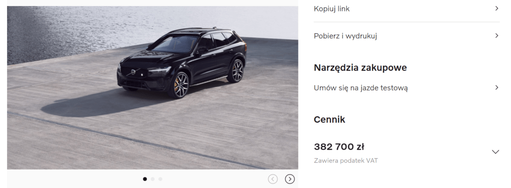 A ile przyjdzie Ci zapłacić za najlepszą wersję XC60? Tu przeskakujemy już z miękkiej hybrydy na prawdziwe auto hybrydowe w wersji recharge. Wybieramy napasioną po brzegi wersję Polestar Enginered. Silnik o mocy 455 KM już na pierwszy rzut oka robi wrażenie. Za zawieszenie Polestar Engineered, 21 calowe felgi, wlot powietrza, bardzo dobry system Audio i inne wspaniałości w  świetnym lakierze Onyx Black zapłacimy łącznie  382 700 zł brutto. Niemal 2 razy więcej w porównaniu do najtańszej wersji auta.
