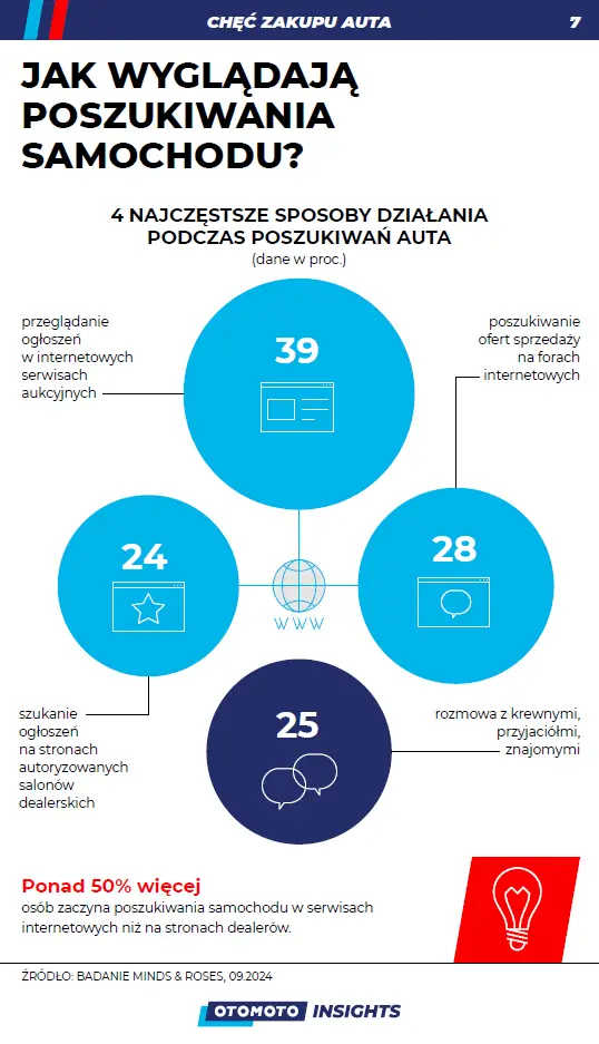 Proces poszukiwania samochodu rozpoczyna się najczęściej w serwisach internetowych – 39% Polaków traktuje je jako pierwszy krok do realizacji swojego celu. W tym kontekście OTOMOTO wyróżnia się jako lider rynku, oferując ogromną bazę ogłoszeń oraz funkcjonalności, które ułatwiają wybór odpowiedniego pojazdu. Wciąż jednak popularne pozostają tradycyjne metody, takie jak konsultacje ze znajomymi czy wizyty u lokalnych dealerów.