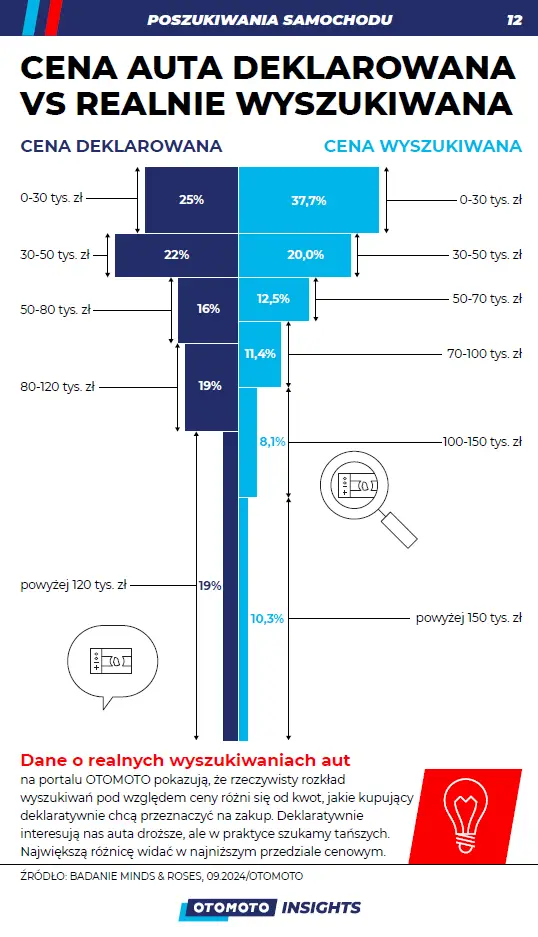 Ciekawym zjawiskiem jest jednak kontrast między deklaracjami a rzeczywistością. Choć wiele osób wyraża chęć zakupu droższych pojazdów, w praktyce najwięcej wyszukiwań dotyczy modeli w przedziale cenowym do 30 tys. zł. To pokazuje, że budżet pozostaje głównym ograniczeniem dla wielu kupujących. Rozbieżność ta jest szczególnie widoczna w przypadku młodszych kierowców oraz osób finansujących pojazdy za pomocą kredytów czy leasingu.